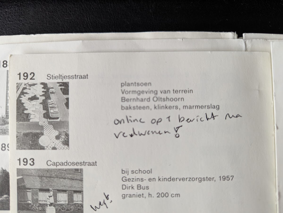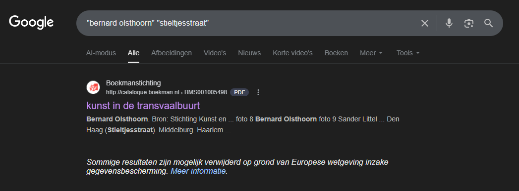 Ook opvallend, ooit dacht ik dat het internet voor altijd was en je werkelijk alles kon vinden. Maar van een verdwenen werk van Bernhard Oltshoorn (onlangs overleden) in de Stieltjestraat is online nog maar een (1!) resultaat te vinden, een PDF met slechte foto's. De opening en sloop was geen nieuws? Die berichten staan niet online? Niemand met belangstelling voor het werk of de wijk te vinden? Zo zonde.