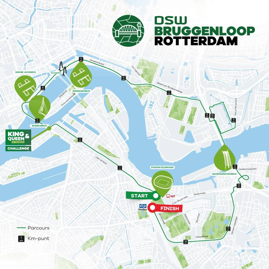 In volgorde loop je over de Erasmusbrug (3K), de Nieuwe Leuvebrug (3.5K), langs de Willemsbrug, over de Boerengatbrug (5K) en uiteindelijk over de Van Brienenoordbrug (10.5K).